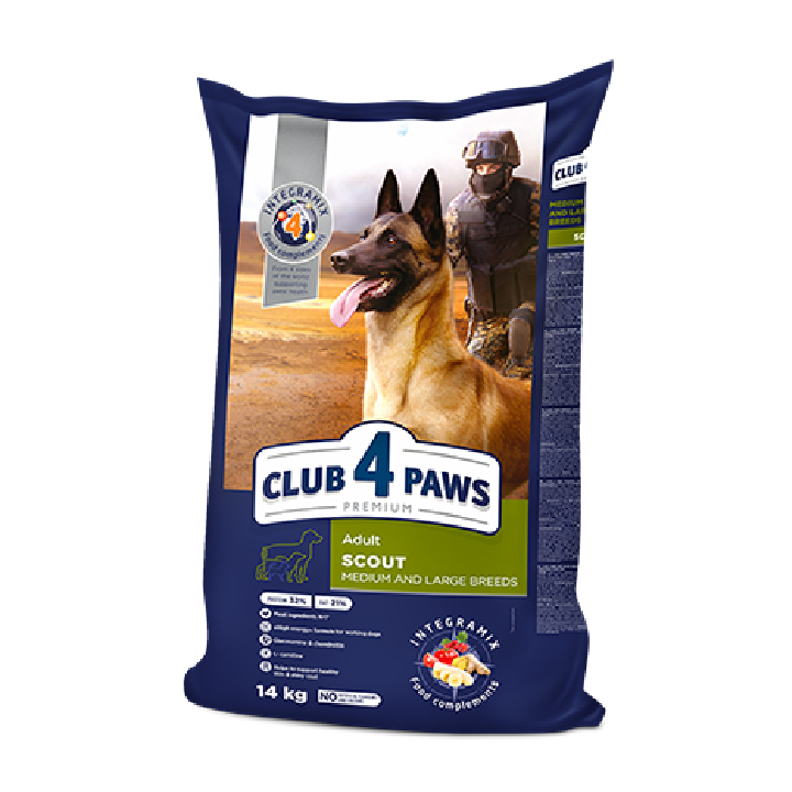 High-calorie balanced premium food for medium and large breed scout dogs with a high protein (32%) and fat (21%) content. In collaboration with dog handlers, CLUB 4 PAWS has created a unique formula that provides the high caloric needs, endurance, attention and high performance of scout dogs.