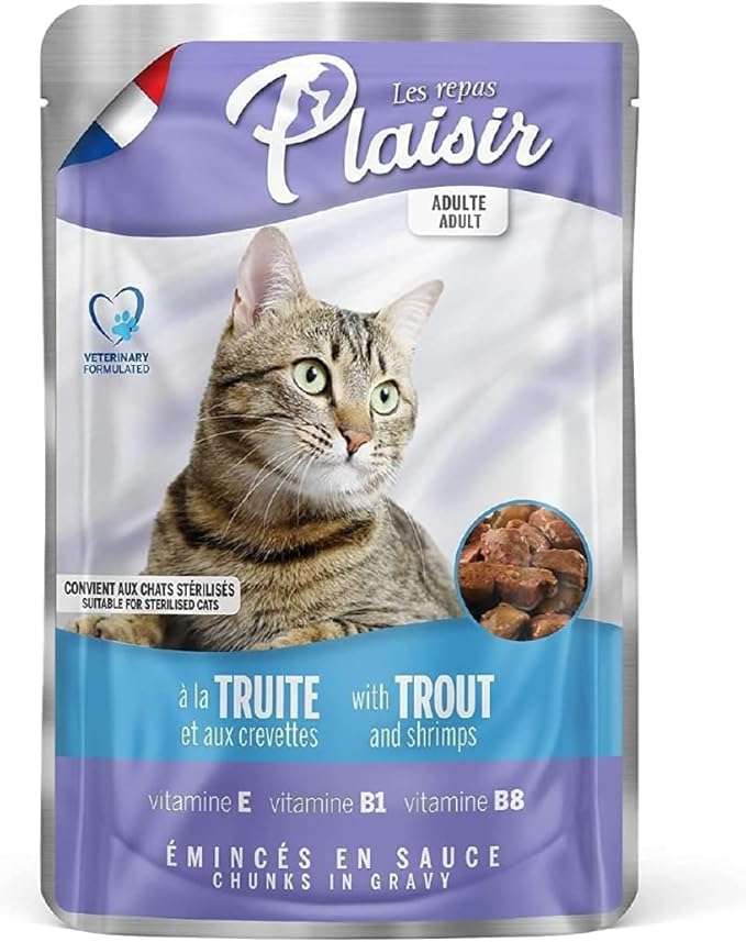 Plaisir Cat Pouch with Trout and Shrimp (100g) is a delicious and healthy treat for your cat. Made with premium trout and shrimp, it provides essential nutrients to support your cat's well-being. This moist, flavoured pouch is perfect as a snack or meal supplement, offering your cat a delicious mix of fish and seafood that they will love.