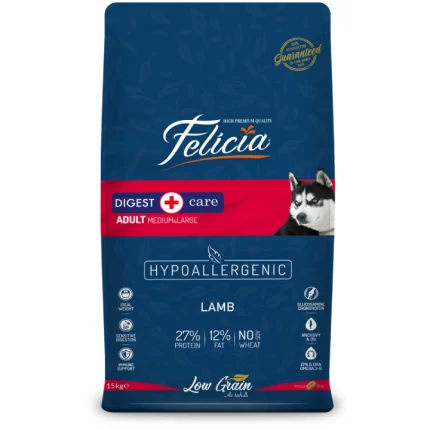 ზრდასრული დიდი ჯიშის საკვები ძაღლისთვის, ცხვრის ხორცით. არის სპეციალური საკვები მგრძნობიარე ზრდასრული ძაღლებისთვის. იგი შექმნილია ზრდასრული მსხვილი ჯიშების ყველა განსაკუთრებული მოთხოვნილების დასაკმაყოფილებლად და მათი ცხოვრების სტანდარტების გასაუმჯობესებლად ნამდვილი ცხვრის ოპტიმალური ცილის და ანჩოუს მდიდარი ინგრედიენტის შერევით. იმის გამო, რომ დიდი ჯიშის ძაღლები მიდრეკილნი არიან სახსრების პრობლემებისკენ, Felicia® Adult Lamb გამდიდრებულია გლუკოზამინისა და ქონდროიტინის მაღალი პროპორციით. გარდა ამისა, მის შემადგენლობაში შემავალი ომეგა 3 და 6 ბუნებრივი ცხიმოვანი მჟავების კომბინაცია ხელს უწყობს ცოცხალი, აბრეშუმისებრი და მბზინავი თმის ფორმირებას და ხელს უწყობს ჯანსაღი კანის დაცვას.