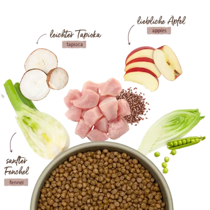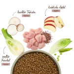 ახალი ცხოველთა კეთილდღეობის ინიციატივით სერტიფიცირებული ქათამი (40%), კარტოფილის სახამებელი, ბარდა (ხმელი, 10%), ახალი ცხოველთა კეთილდღეობის ინიციატივით სერტიფიცირებული ინდაური (10%), კარტოფილი (ხმელი, 5%), ბარდის სახამებელი, ტაპიოკა (ხმელი, 4%) ორაგულის ზეთი, ცილის ჰიდროლიზატი, დიკალციუმის ფოსფატი, ვაშლის ფაფა (გამხმარი), სელის თესლი (0,5%), ნატრიუმის ქლორიდი, კამა (ხმელი, 0,2%), ვაშლი (ხმელი, 0,2%), ვარდის თეძოები (ხმელი), ქლიავი. ყაყაჩო (ხმელი, 0,1 %), ვარდკაჭაჭა (ხმელი, 0,05 %).