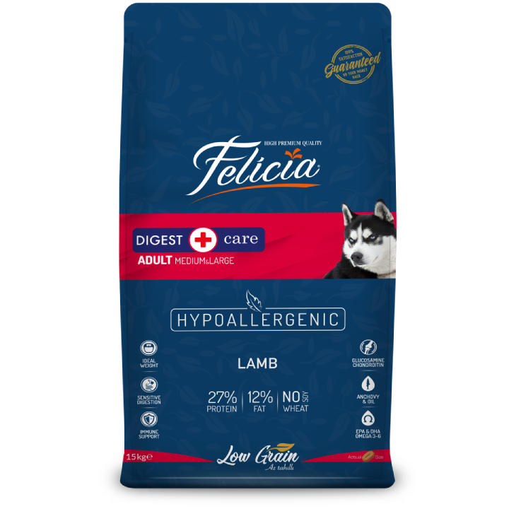 არის სპეციალური საკვები მგრძნობიარე ზრდასრული ძაღლებისთვის. იგი შექმნილია ზრდასრული მსხვილი ჯიშების ყველა განსაკუთრებული მოთხოვნილების დასაკმაყოფილებლად და მათი ცხოვრების სტანდარტების გასაუმჯობესებლად ნამდვილი ცხვრის ოპტიმალური ცილის და ანჩოუს მდიდარი ინგრედიენტის შერევით. იმის გამო, რომ დიდი ჯიშის ძაღლები მიდრეკილნი არიან სახსრების პრობლემებისკენ, Felicia® Adult Lamb გამდიდრებულია გლუკოზამინისა და ქონდროიტინის მაღალი პროპორციით. გარდა ამისა, მის შემადგენლობაში შემავალი ომეგა 3 და 6 ბუნებრივი ცხიმოვანი მჟავების კომბინაცია ხელს უწყობს ცოცხალი, აბრეშუმისებრი და მბზინავი თმის ფორმირებას და ხელს უწყობს ჯანსაღი კანის დაცვას.