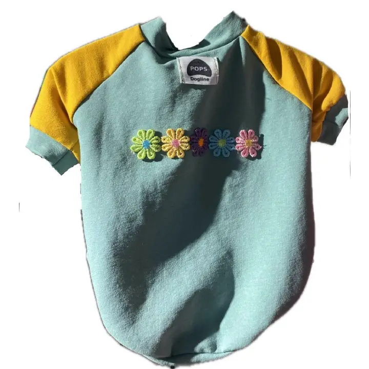 ფოფსის ყვითელი მაისური ყვავილებით. რომელიც დამზადებულია მაღალი ხარისხის, კომფორტული მატერიისგან, საქართველოში. განკუთვნილია M ზომის ძაღლებისთვის.